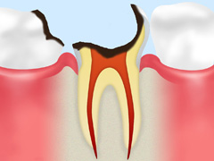 歯冠(歯の上の部分)がほとんど溶かされた状態です。神経が死んでしまうといったん痛みはなくなりますが、歯の根の先に膿がたまるとふたたび激しく痛みます。 | ほとんどの場合抜歯が必要になります。抜歯後は入れ歯治療・インプラント治療・ブリッジ治療で歯の機能の回復を図ります。 |